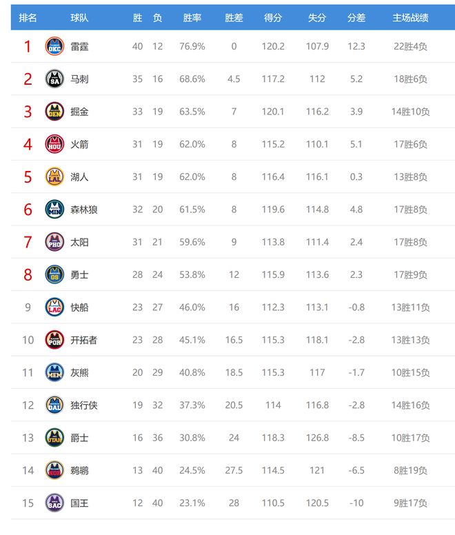 勇士赢球后结束2连败,战绩28胜24负排名西部第八,领先第九的快船4个胜场。太阳输球后31胜21负,排名西部第七,领先勇士3个胜场。